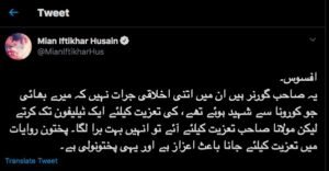 عوامی نیشنل پارٹی کے جنرل سیکرٹری میاں افتخار حسین نے بھی اپنے ٹویٹر پیغام میں گورنر کے کے ٹویٹ کے رد عمل میں بتایا ہے، کہ اگر وہ بھی اب کے بھائی کی وفات پر تعزیت کرکے پشتون ہونے کا ثبوت نہ دیے سکے۔ ٹویٹ ذیل میں ملاحظہ کیجئے۔